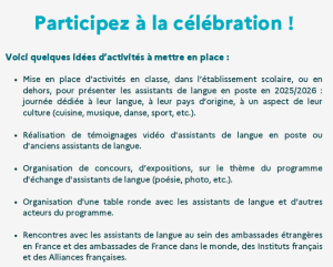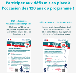 Si votre établissement accueille cette année scolaire un.e assistant.e et/ou que cela a été le cas les années précédentes, vous allez pouvoir y célébrer cet anniversaire le 4 décembre prochain mais également tout au long de l’année scolaire 2025-2026 autour d’initiatives et d’événements variés.